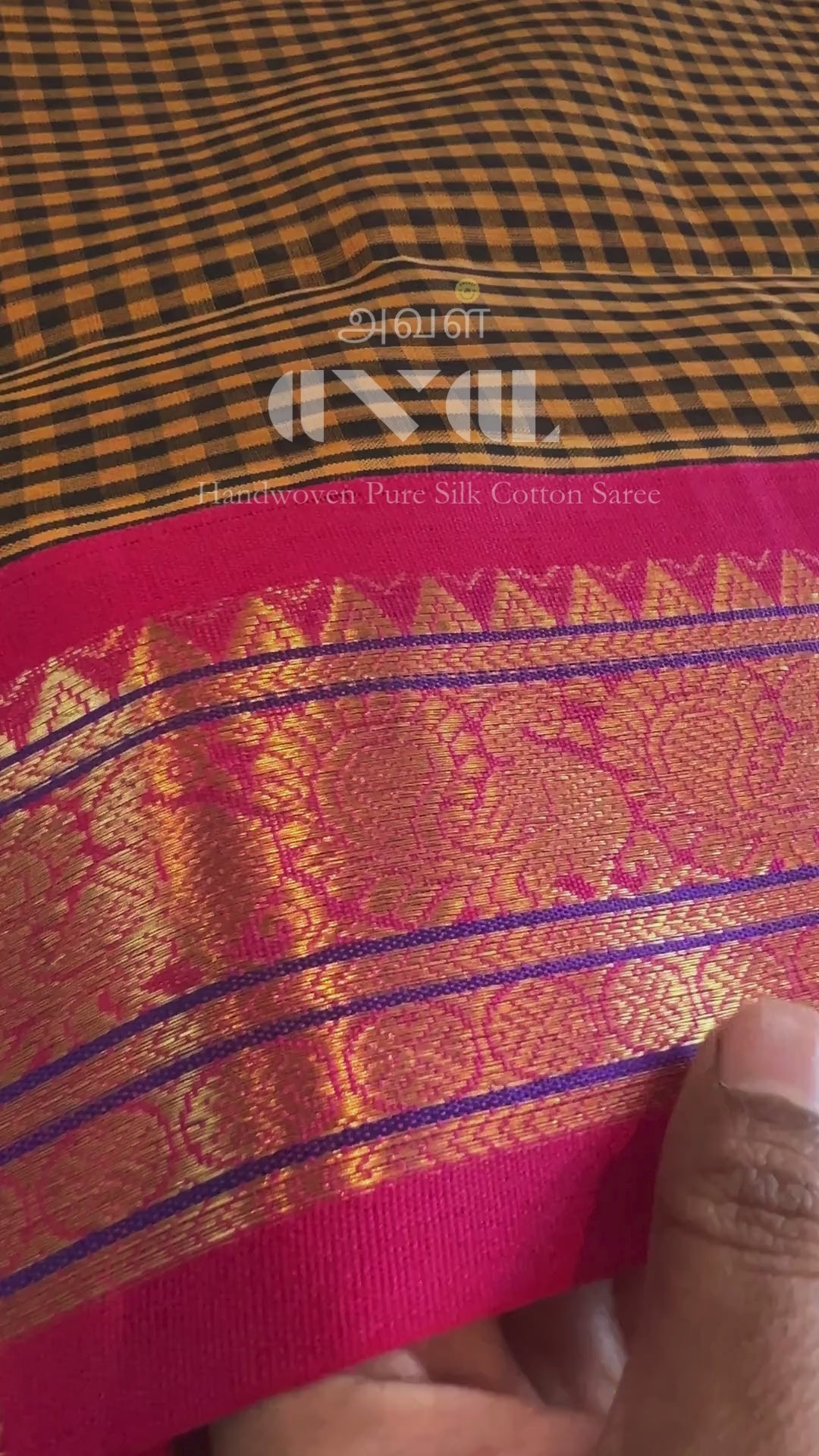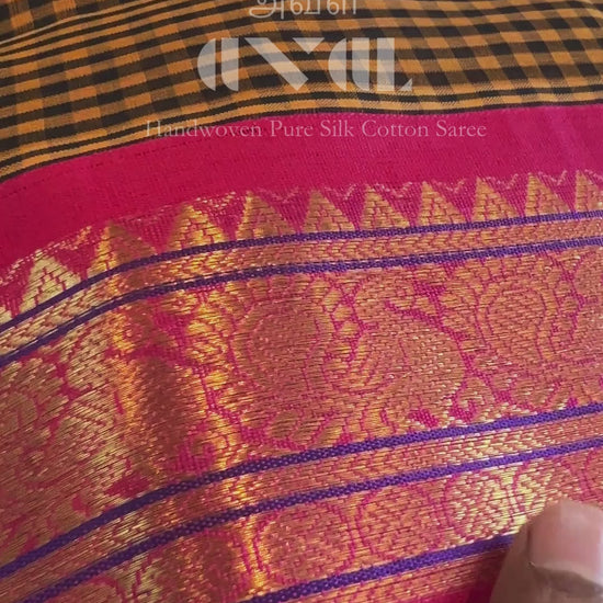 Angadi's AVAL Handwoven Pure Silk Cotton sarees are a perfect blend of pure silk yarn with pure cotton yarn on 60 (Silk): 40 (Cotton) ratio. This fusion combines the luxury and shine of silk with the softness, comfort and breathability of cotton.